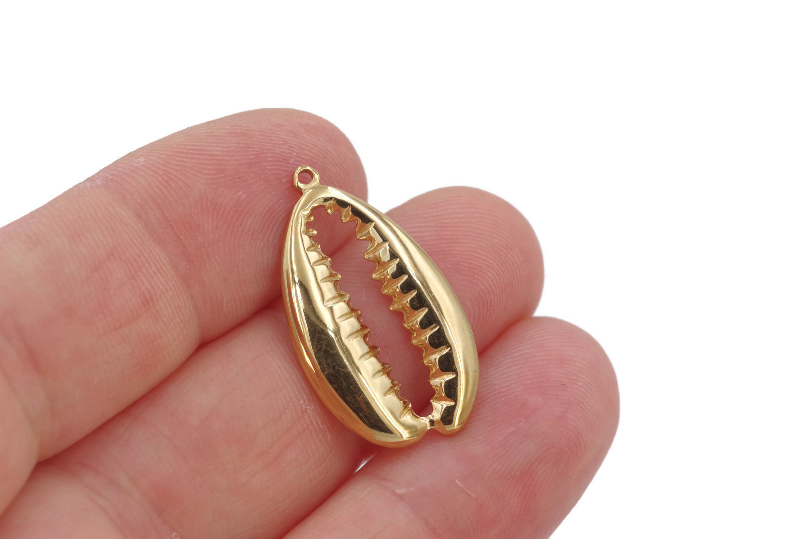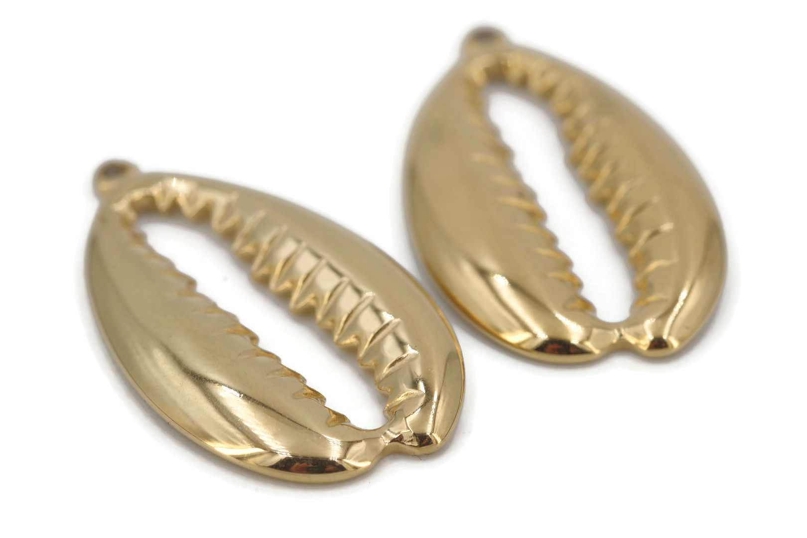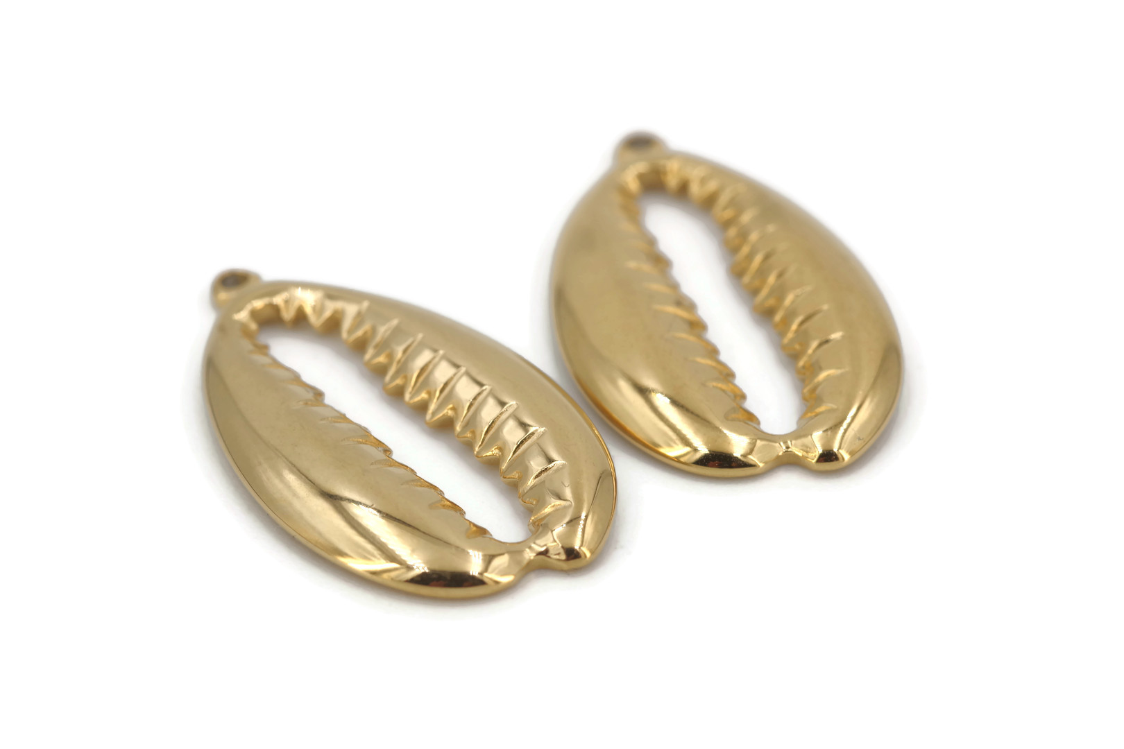 1 Breloque Charm cauri doré ajouré – Dimensions : 27 x 15 x 2.5 mm – Acier inoxydable