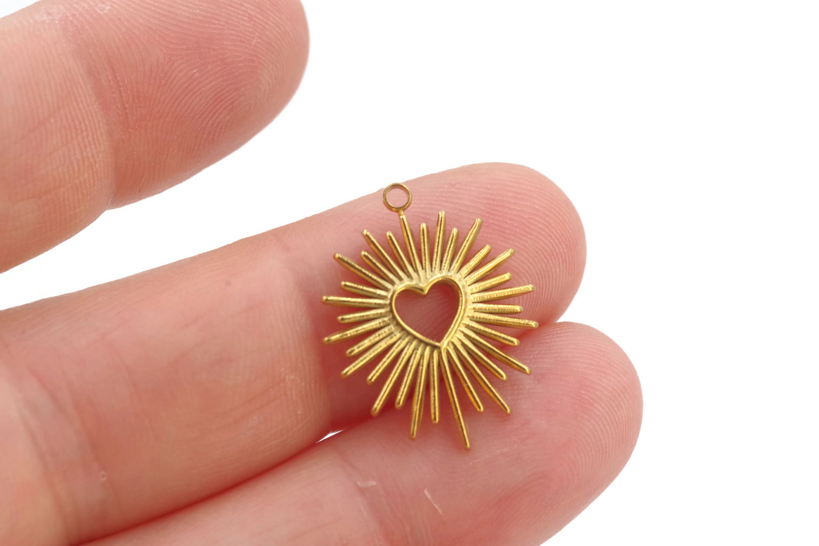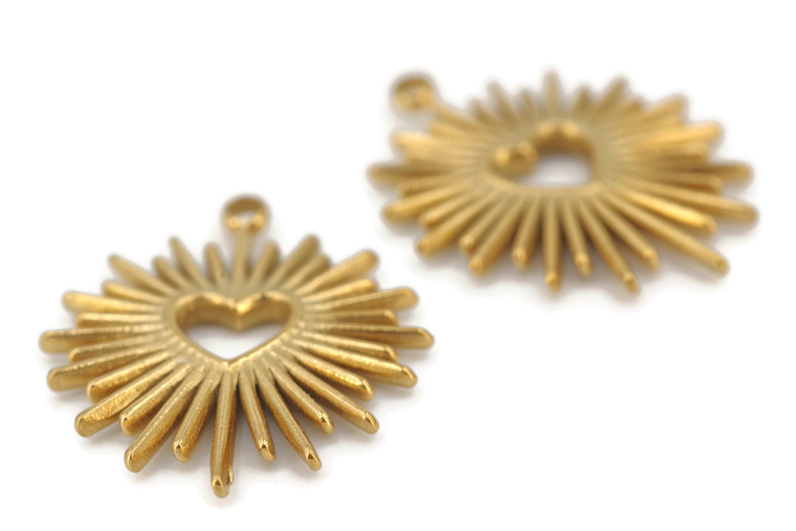 1 Breloque charm soleil cœur doré – Dimensions : 22 x 18 x 1.5 mm – Acier inoxydable