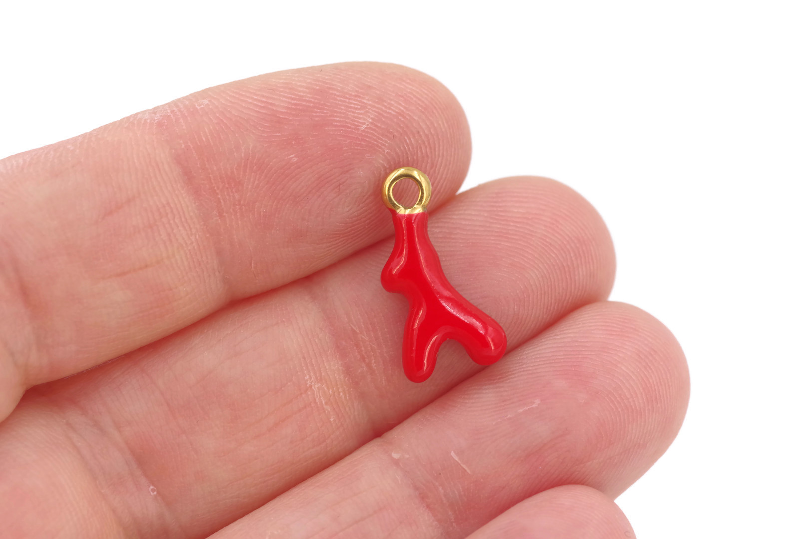 Ajoutez une touche porte-bonheur à vos créations DIY avec ce petit charm corail rouge en acier inoxydable doré, rehaussé d’un émail brillant.