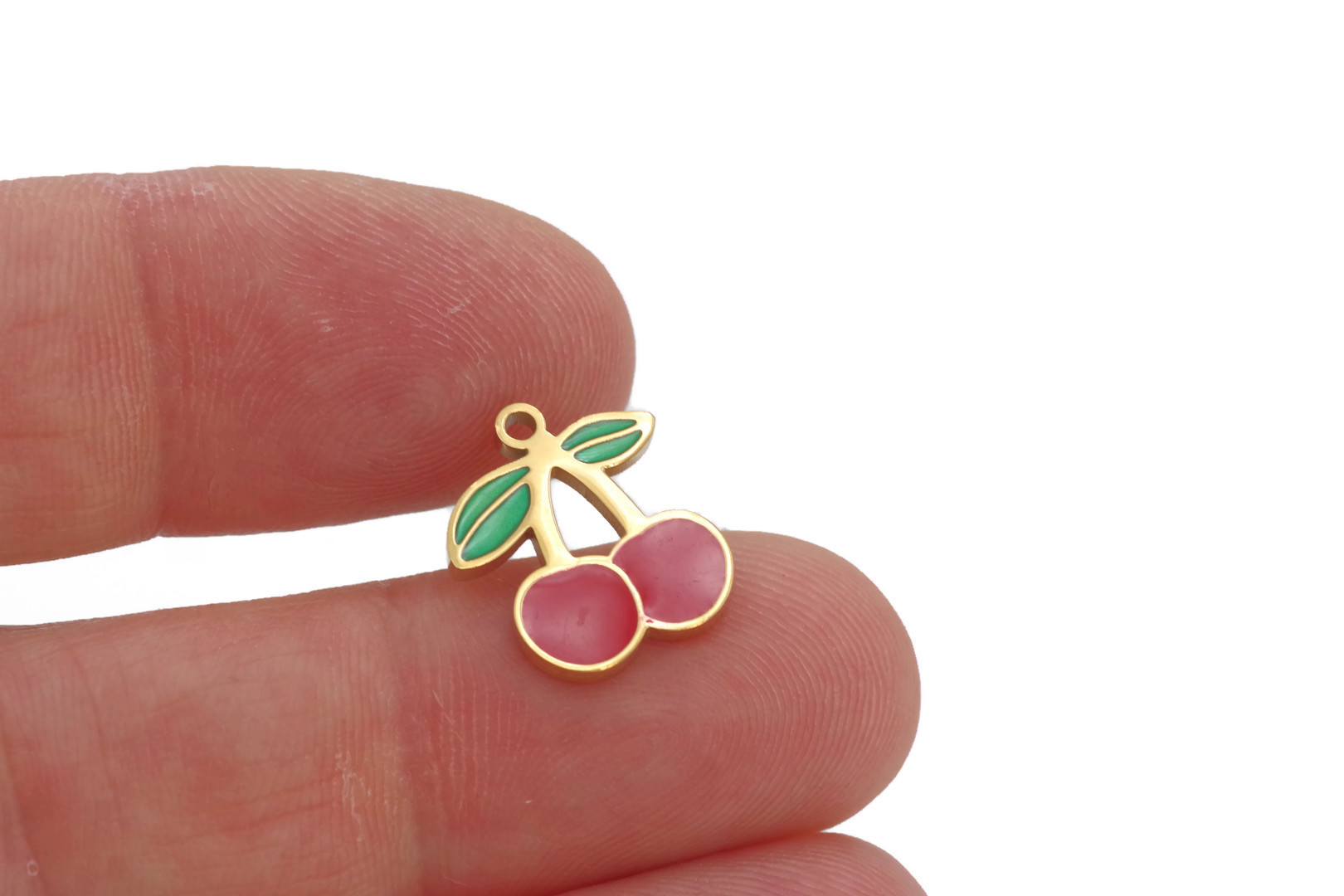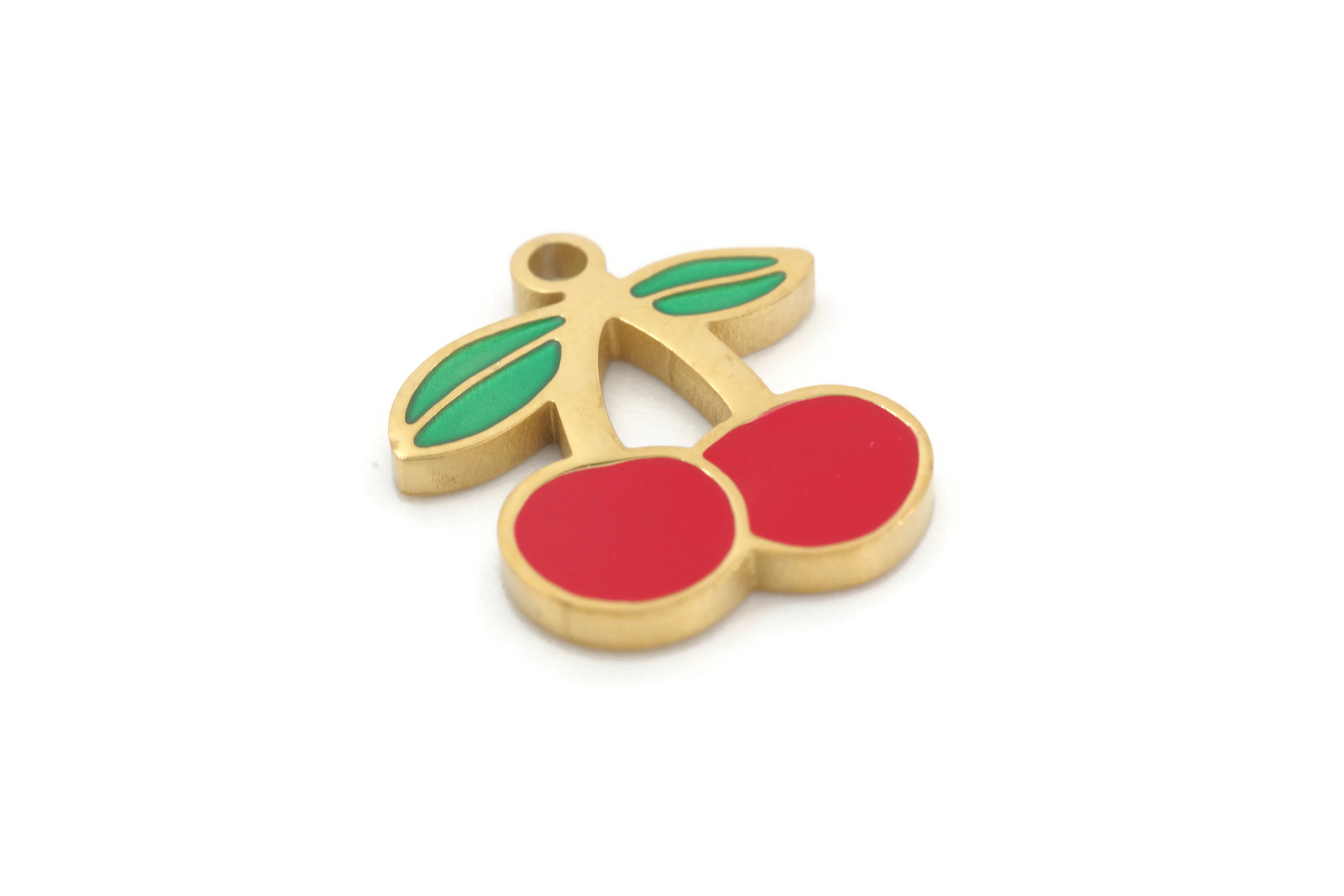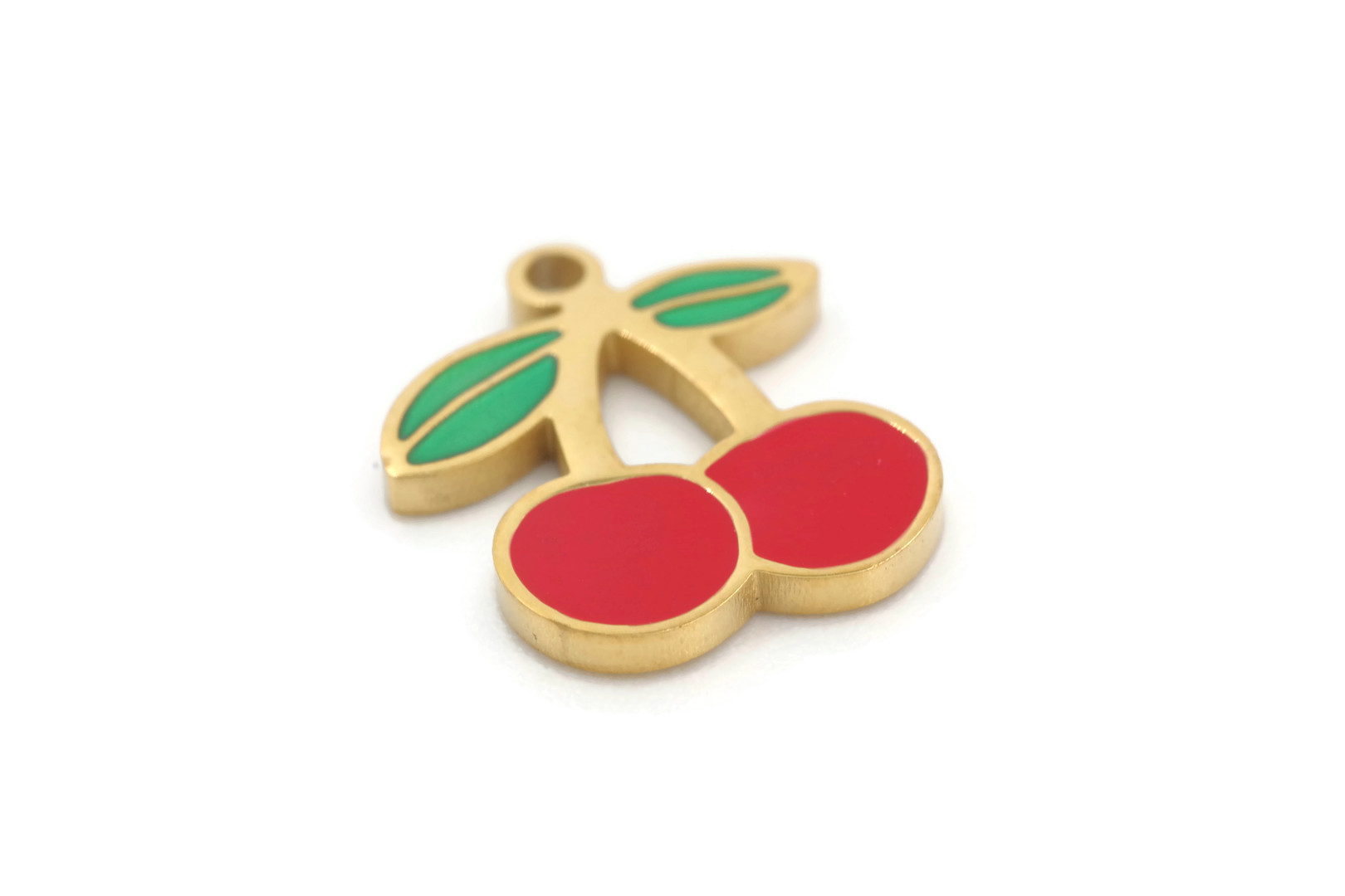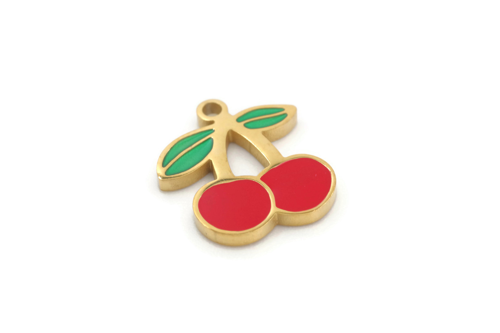 1 Charm cerises émaillées – Acier inoxydable doré – Dimensions : 15 x 13 mm – Vendu à l’unité