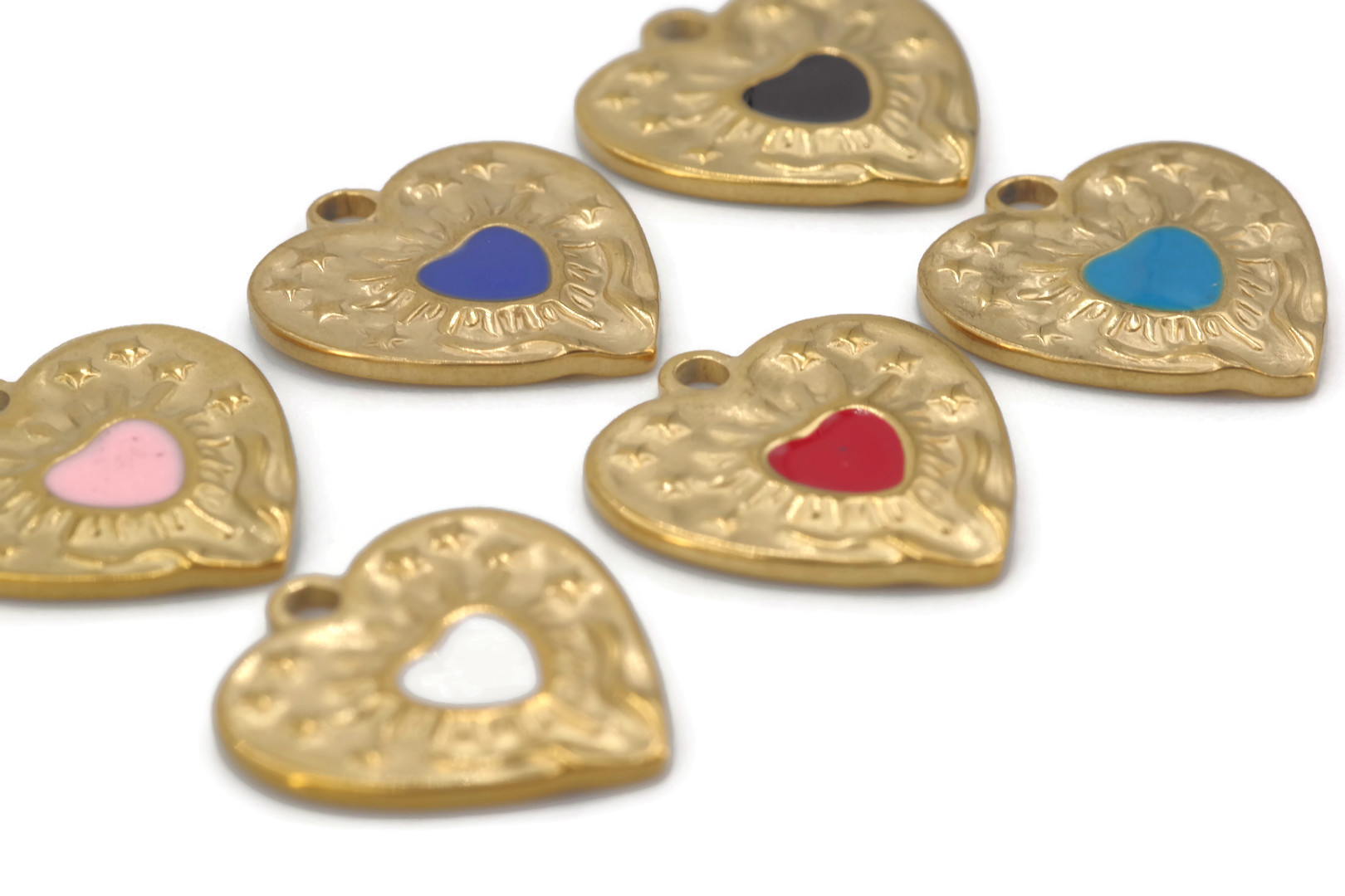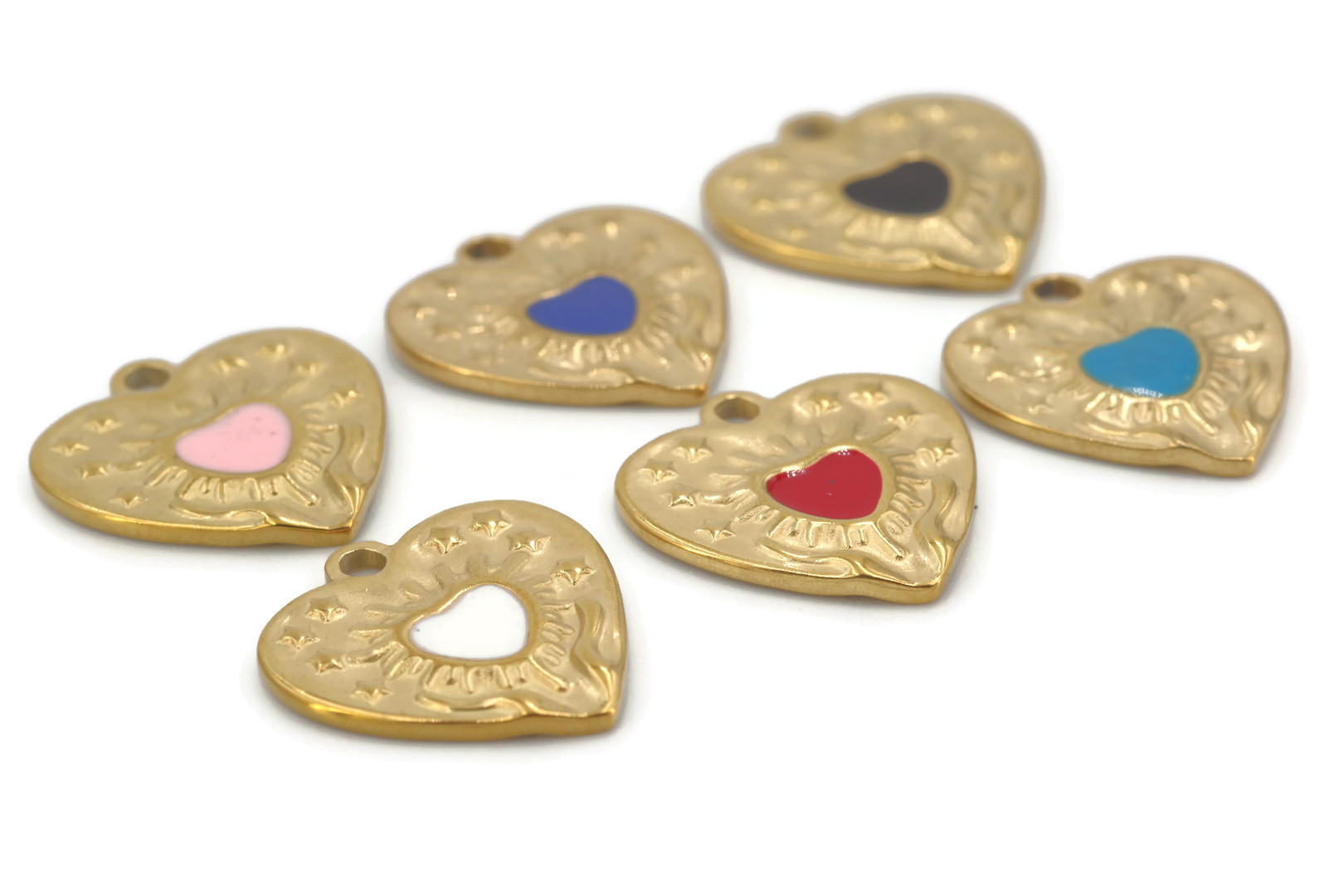 Charm en forme de cœur plat en acier inoxydable doré avec finition gravée et motif central coloré en émail. Dimensions : 17x17x1,5 mm. Trou : 2 mm. Disponible en plusieurs coloris (bleu clair, bleu roi, rose, rouge, noir ou blanc), à sélectionner dans la liste déroulante. Idéal pour composer des colliers charms, bracelets ou boucles d’oreilles DIY. Résistant à l’eau, hypoallergénique et durable. Parfait pour ajouter une touche symbolique et personnalisée à vos créations. Vendu à l’unité.