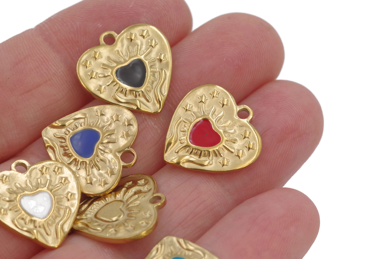 Ajoutez une touche de douceur, de couleur et de symbolique à vos créations DIY avec ce charm en forme de cœur en acier inoxydable doré, orné d’un motif central émaillé.